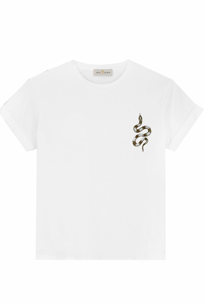 Een slang is niet alleen heel stoer en mooi om te zien; het dier staat ook symbool voor transformatie. We vonden het dan ook een heel mooi idee om deze op een deel van onze shirts van biologisch katoen te verwerken! We hopen dat er een transformatie komt in de (mode)wereld. We hopen dat mensen bewustere keuzes maken en minder kopen, maar dan van een betere kwaliteit. Met dit shirt van biologisch katoen met slang maken we alvast een begin!