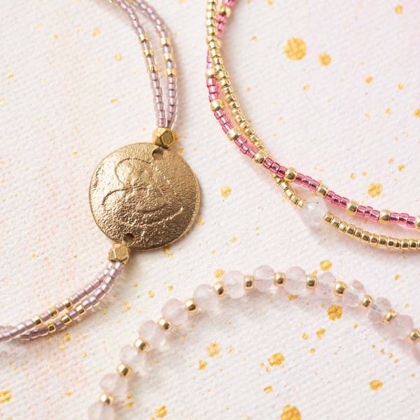 Rozenkwarts staat voor (zelf)liefde en is daarom het ideale cadeau! Dit armbandje is een combi tussen messing kralen en edelstenen.