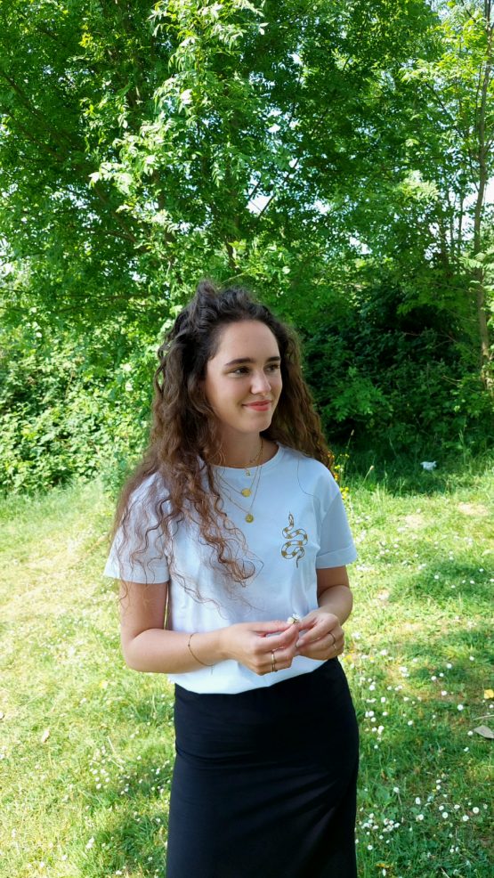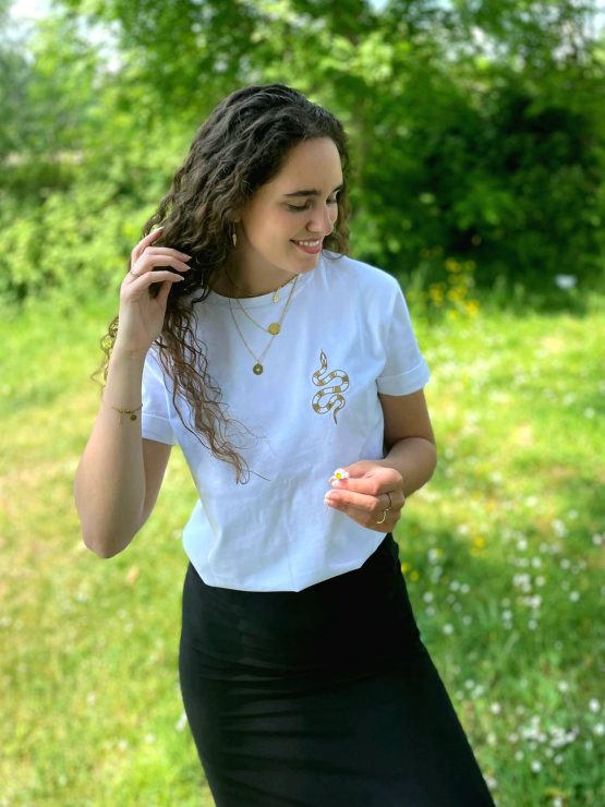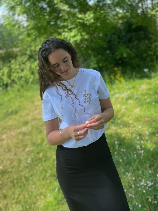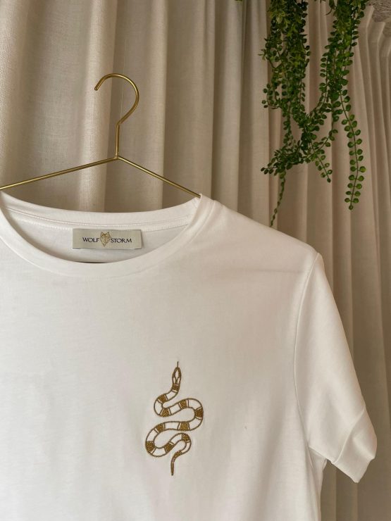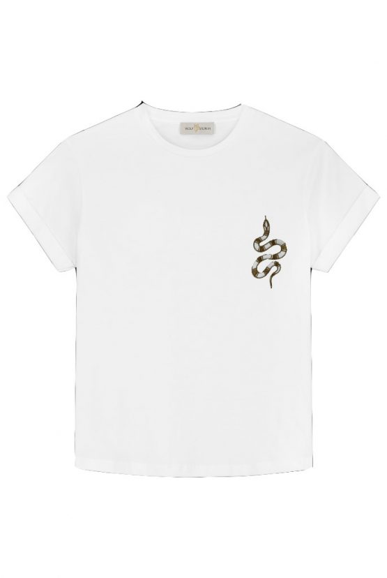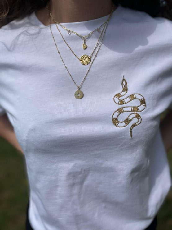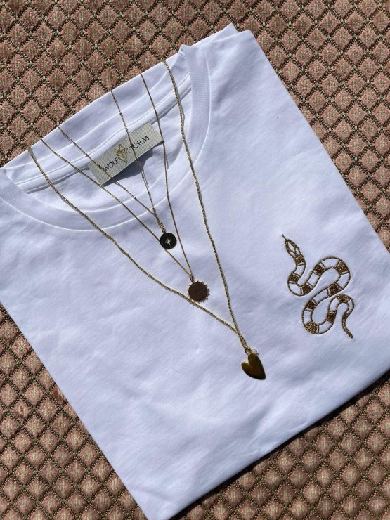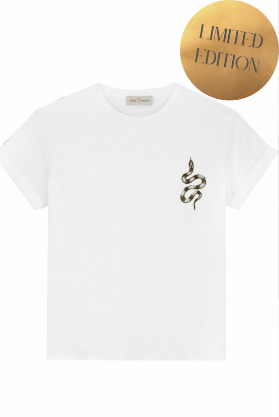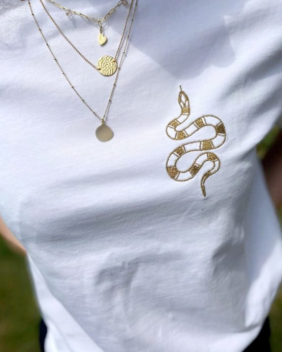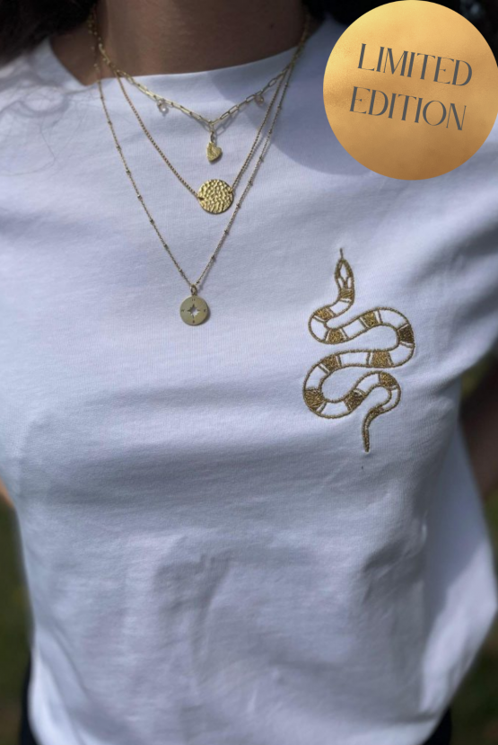 Dit fijne shirt van ons eigen label heeft een edgy uistraling door de goudkleurige slang die op het shirt geborduurd is. Hoe ga jij deze stylen?