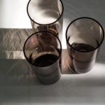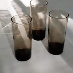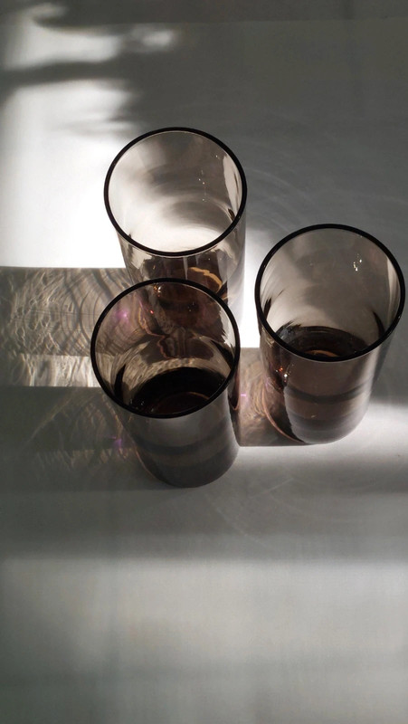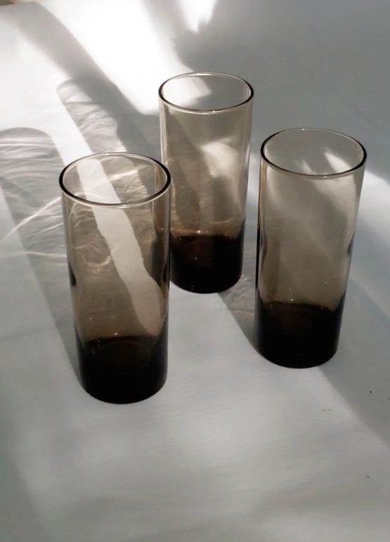 Deze mooie vintage glazen van rookglas hebben een typische retrolook uit de jaren ’70. Zowel de look als de kwaliteit zijn mooi gebleven met het verstrijken van de jaren. De onderkant van de glazen heeft een paarse gloed wanneer de zon erop valt.