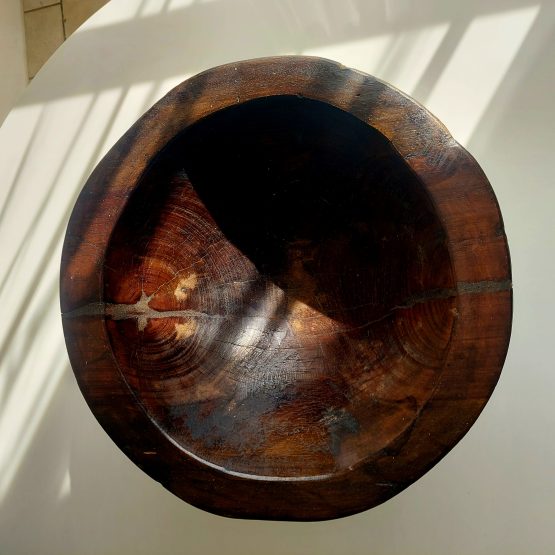 Royale trog van teakhout. De mand heeft organische vormen en heeft een robuuste look. Dit is een grotere variant, zodat dit echt een blikvanger in je interieur is. Past perfect in een interieur met een Japandi, Wabi Sabi of sobere stijl. Heel leuk als fruitmand!